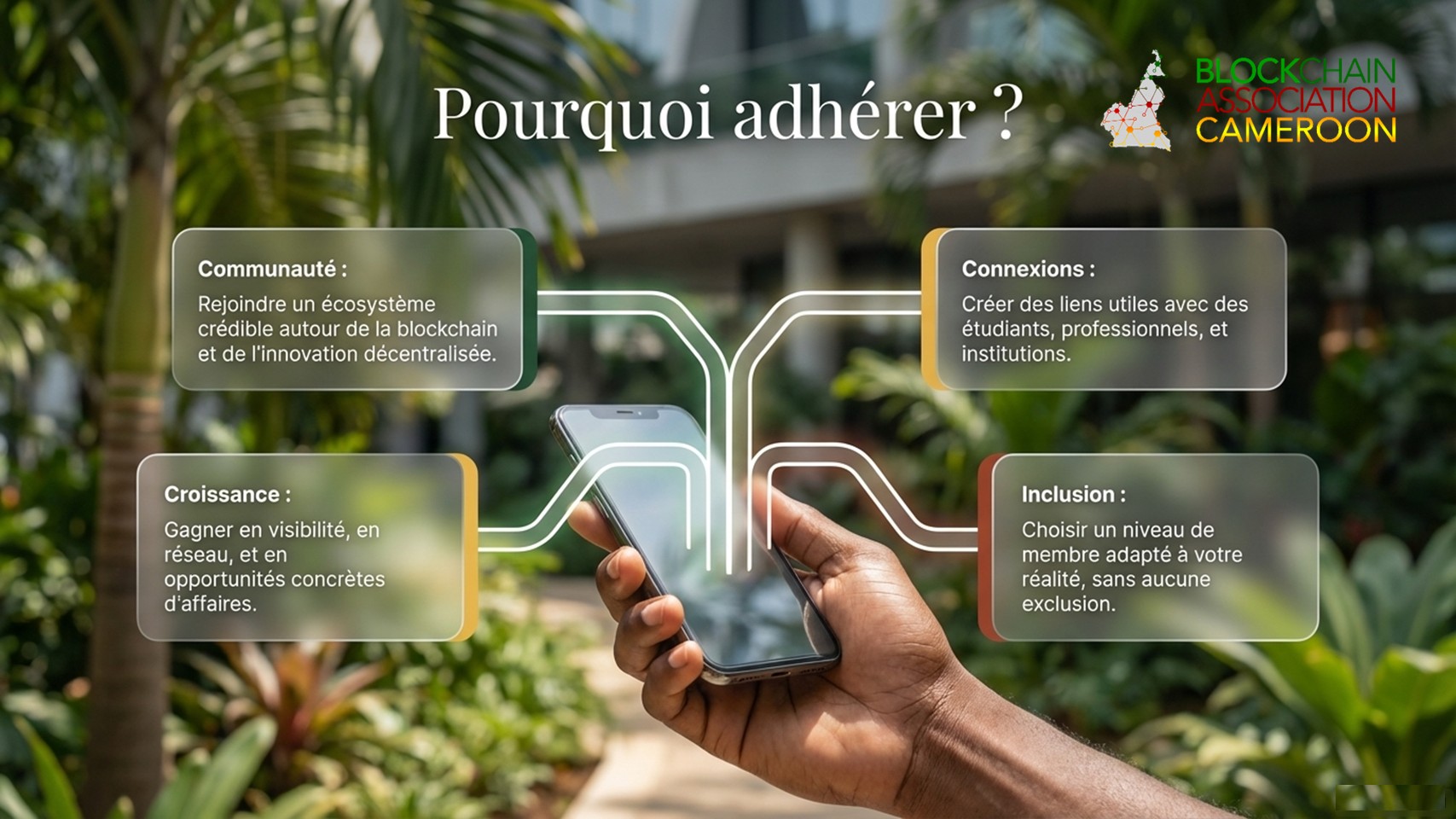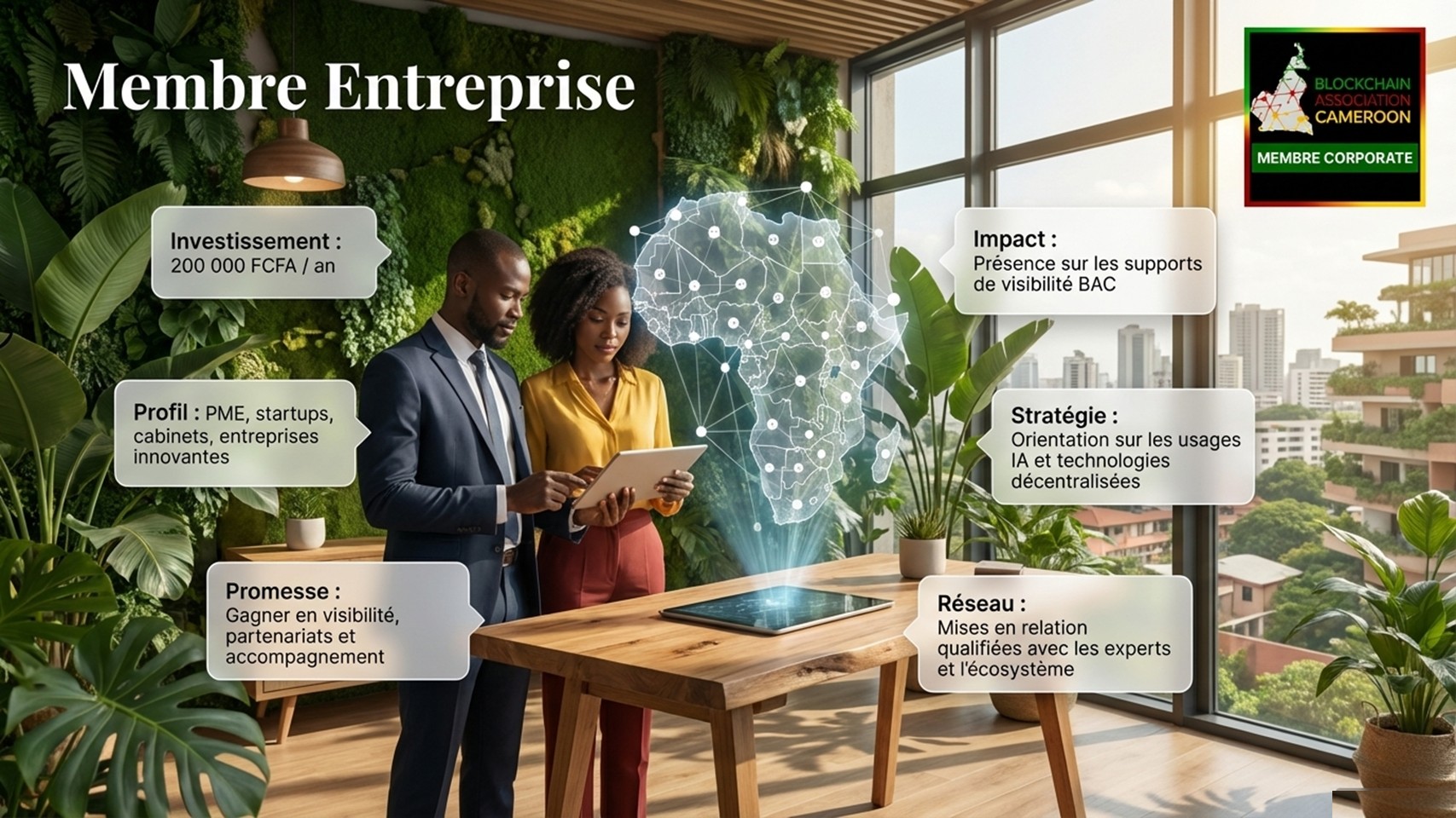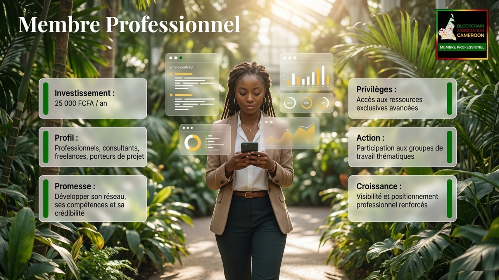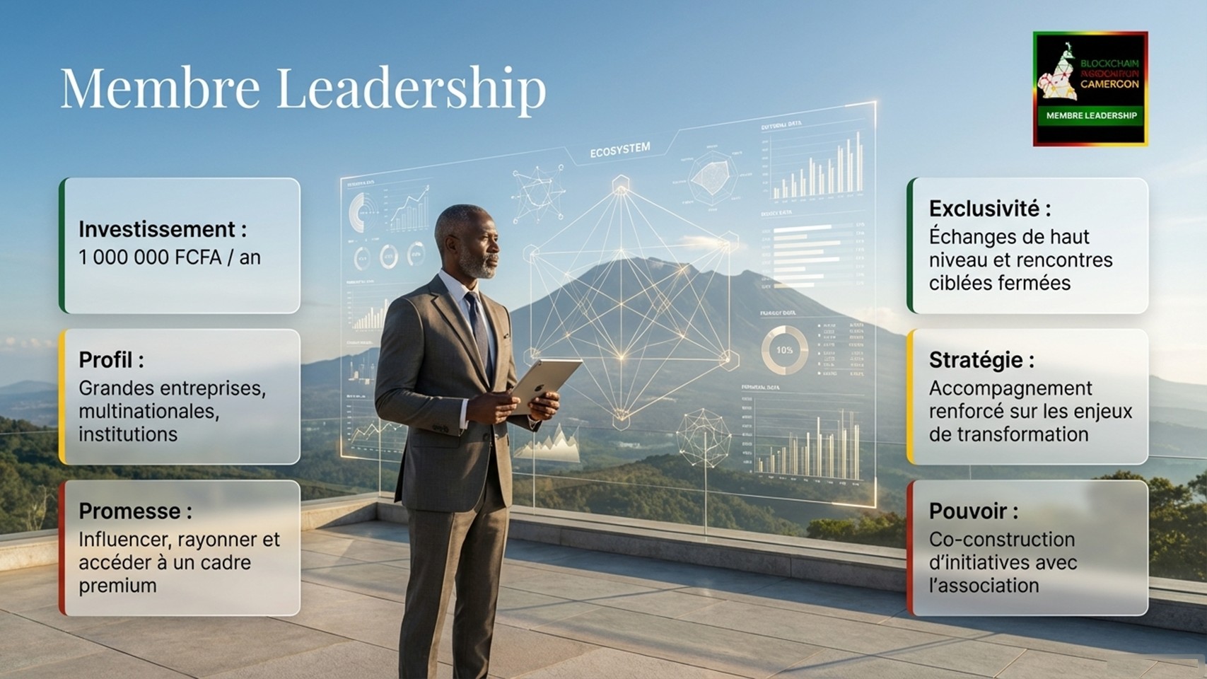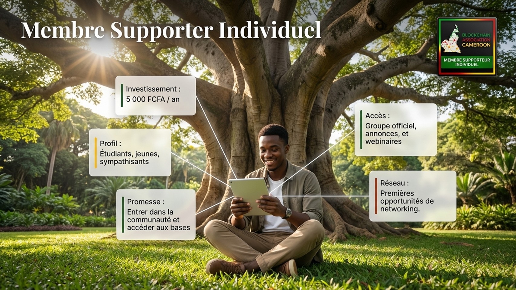 Exemples de bénéfices : Statut officiel de membre de la Blockchain Association of Cameroon; Accès au groupe communautaire officiel et aux annonces générales; Réception de la newsletter et des invitations ouvertes; Accès aux événements publics et webinaires ouverts.